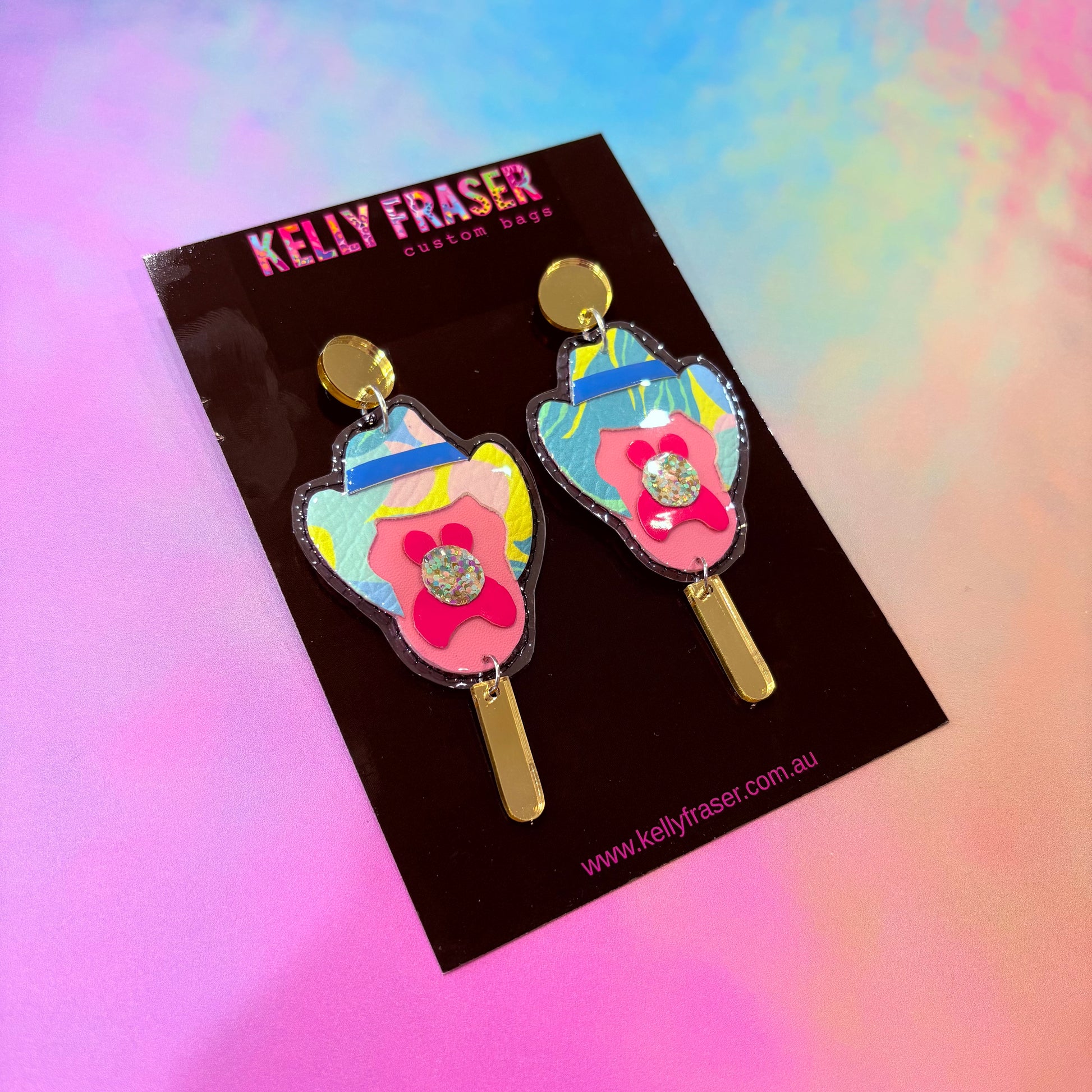 Make a statement in these fun and colourful Bubble O Bill earrings. Each one of our Bubble O Bill “dangles” is hand cut from multiple textile pieces and mirrored acrylic popsicle stick. No 2 dangles are the same.